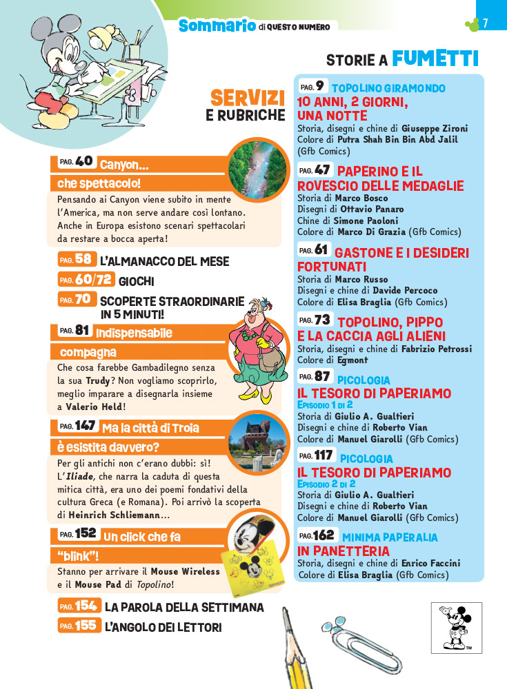 La storia “Topolino giramondo - Dieci anni, due giorni e una notte ”, di Giuseppe Zironi ci racconta un modo di viaggiare inconsueto, che necessita di quel pizzico di spirito anticonformista che non sempre è facile avere. E a proposito di viaggi, in questo numero trovate un servizio dedicato ai Canyon spettacolari che si trovano, udite udite, non in America, ma nella nostra Europa. Chi ama la storia, invece, troverà pane per i sui denti con le pagine dedicate alle origini della mitica città di Troia, dall'Iliade sino alla scoperta di Heinrich Schliemann.