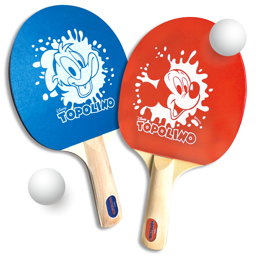 Le racchette hanno dimensioni 15×25 cm e i due lati in gomma, sono disponibili nei colori blu e rosso e hanno il mitico logo del Topo incastonato sul manico.