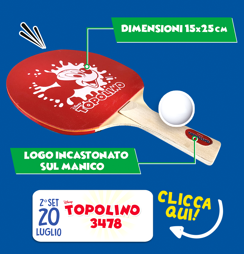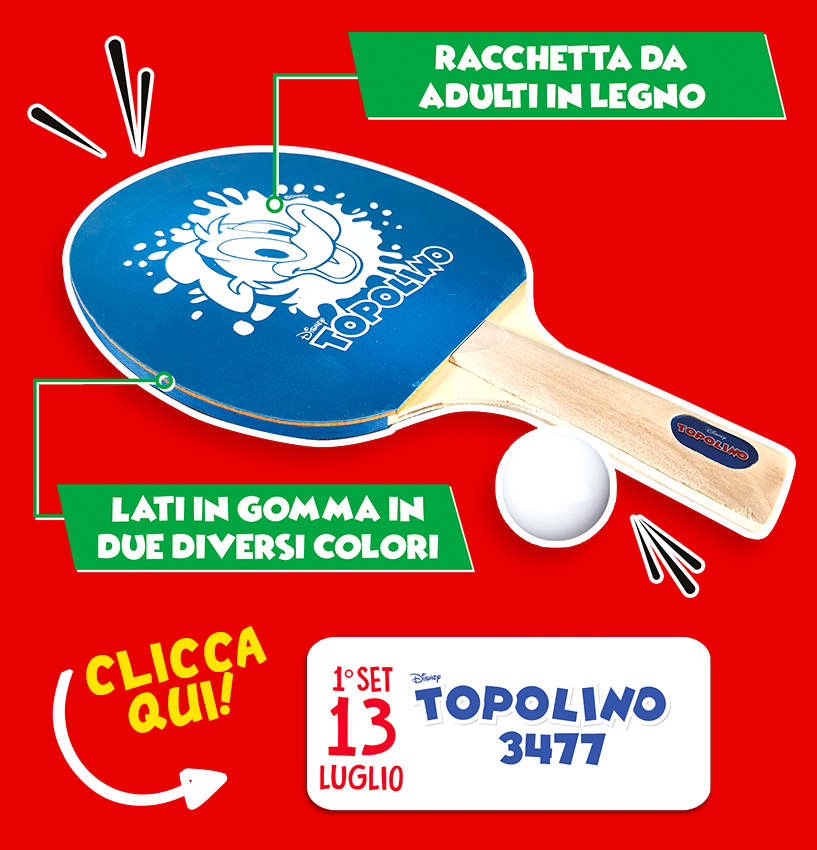 La prima racchetta (blu con protagonista Paperino) e la pallina sono disponibili con il numero 3477 del 13 luglio, mentre la seconda – rossa e con protagonista Topolino – arriva mercoledì 20 luglio insieme a Topolino 3478.